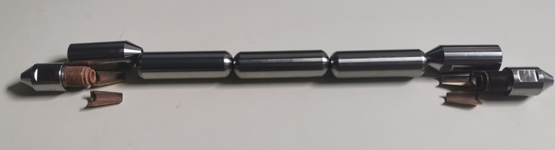 1、外径:φ44mm 电缆挤压拉脱力:5500-5000ibs 2、中间钨钢加重块单件重量:3.5Kg(φ44.5*150mm),普通材料:1.5Kg 3、电缆贯穿钨钢块,根据需要的重量可以随时增加钨钢块(一般8-10块)
